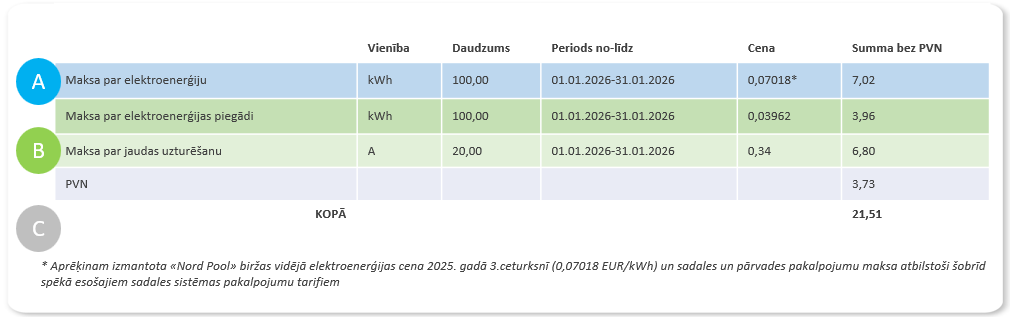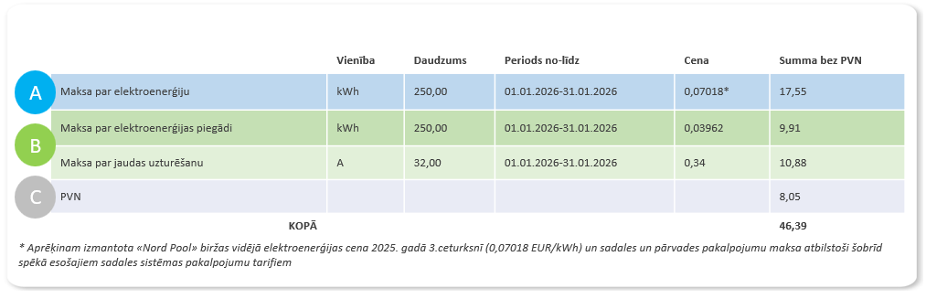 Rēķina piemērs bez valsts atbalsta (pieslēguma tehniskie parametri: 1 fāze 32 A)