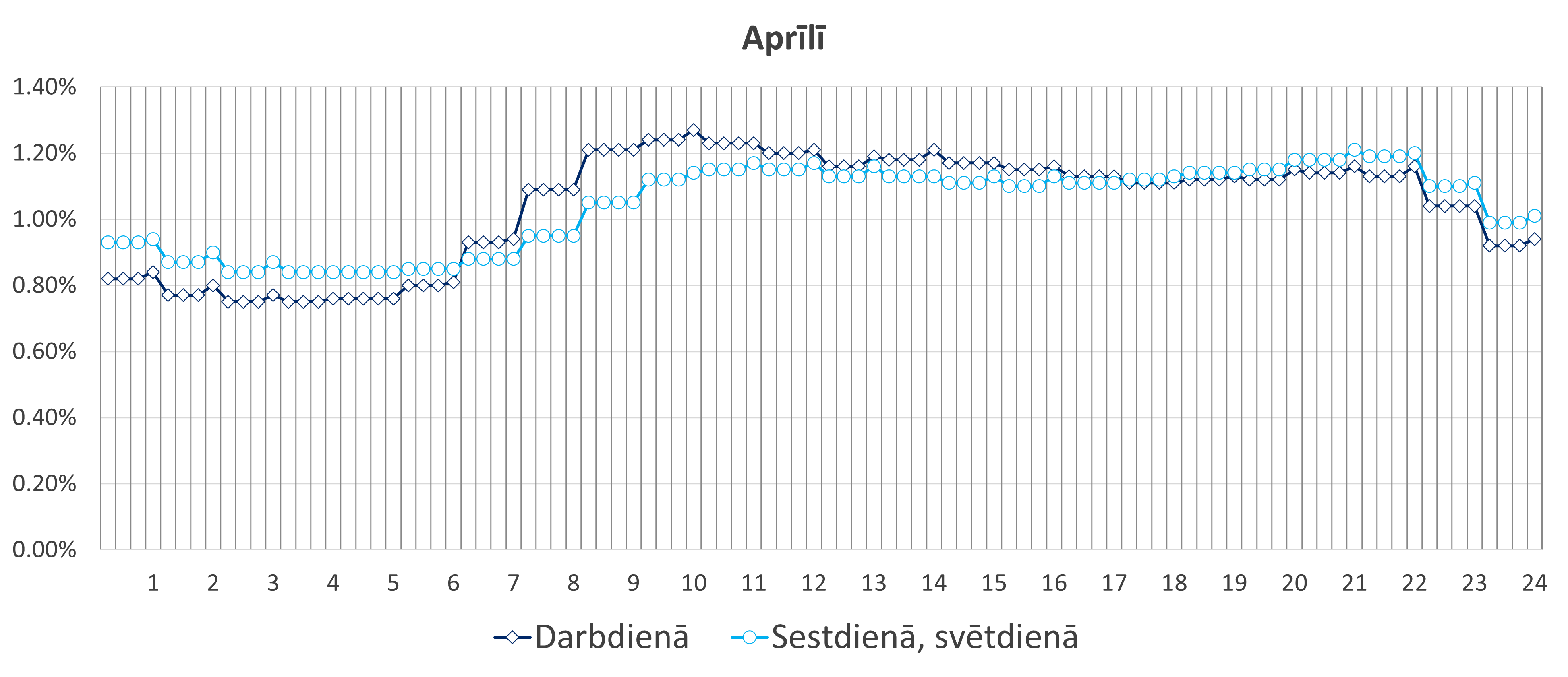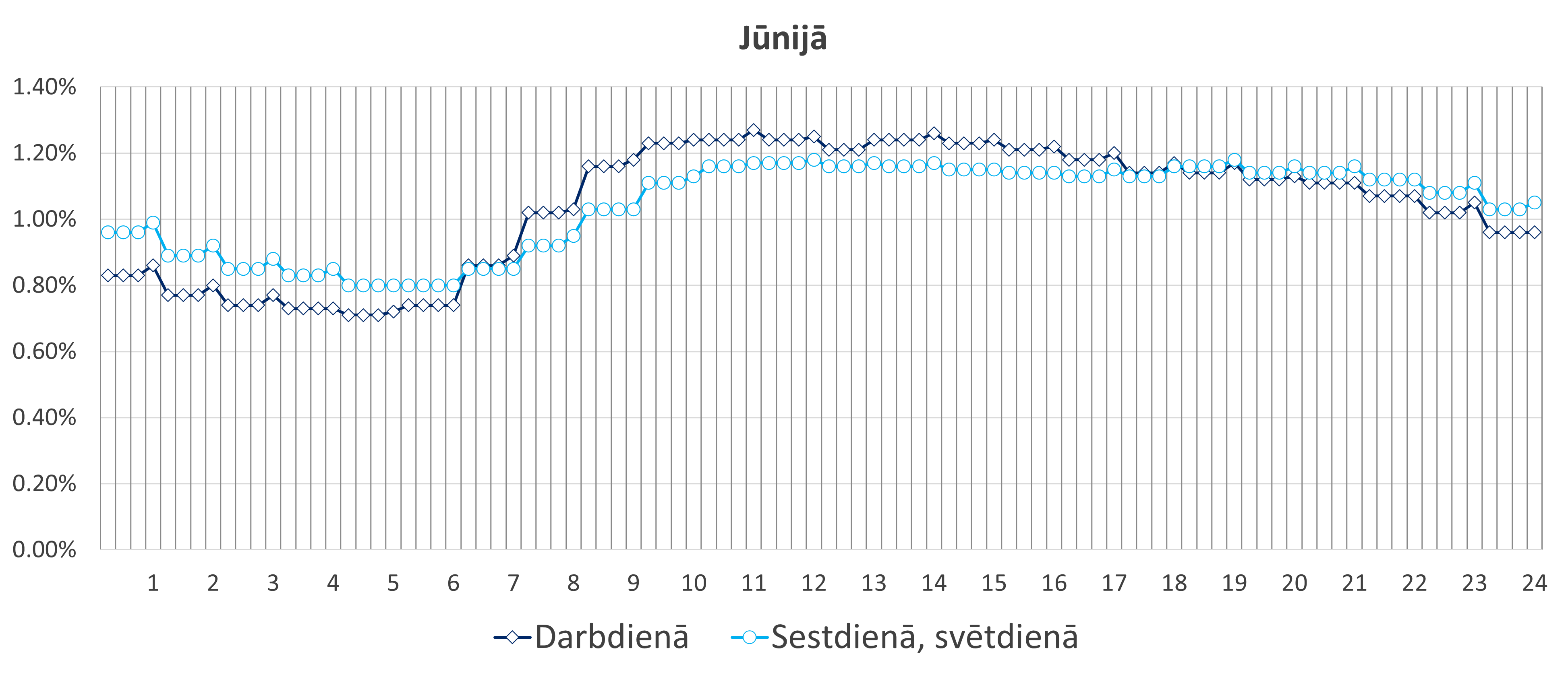 Tipveida slodžu sadalījuma grafiks tiek sastādīts katram gada mēnesim, atsevišķi darbdienām un sestdienām, svētdienām. 2025. gada grafikā redzams vienā diennaktī patērētās elektrības tipveida sadalījums (%) pa stundām.